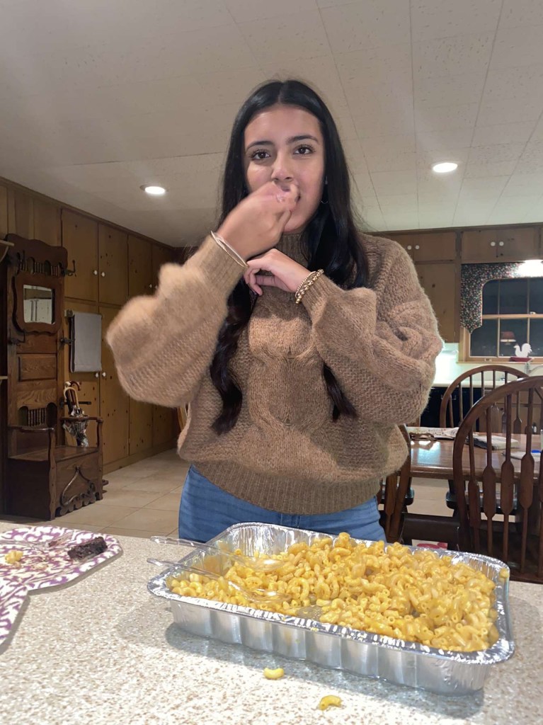 Mayeli digs in to some Mac n cheese Thanksgiving 2020